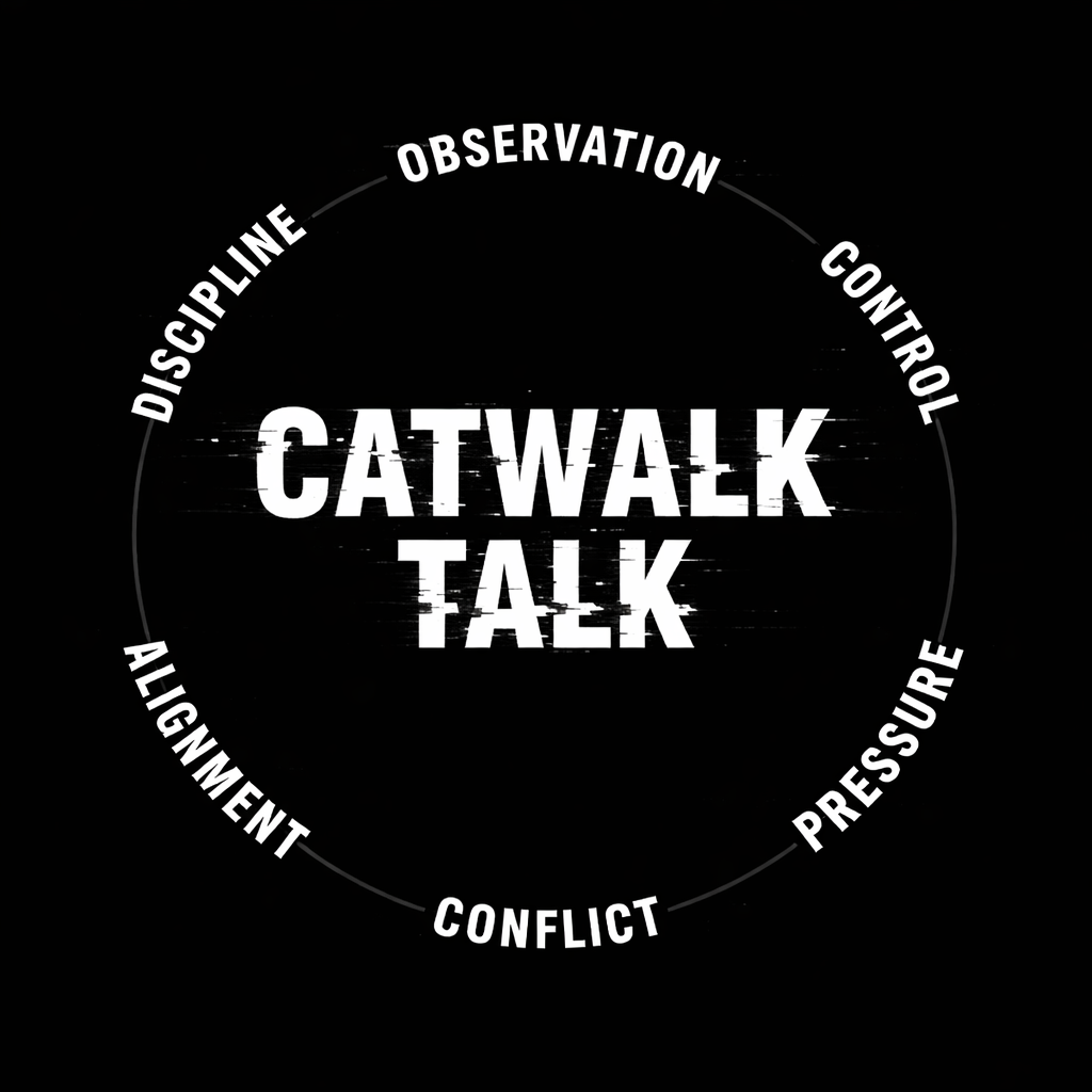 The Catwalk Talk cycle investigates how trained bodies operate within systems of observation, discipline and judgement. The runway becomes a calibrated environment where gesture, timing and position are continuously measured.
